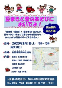 会場では、長泉町ふるさとスゴロクや紙芝居、けん玉などの昔の遊びと、あたたかいお汁粉のサービスなどで楽しめます。家族で参加して、福を招きませんか。