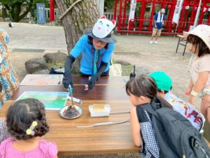 割狐塚稲荷の土台をつくった膨らむ溶岩実験の後は、磁石を持って溶岩探しのお散歩へ♪