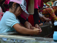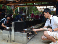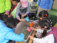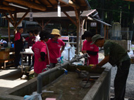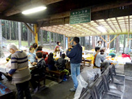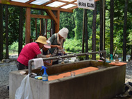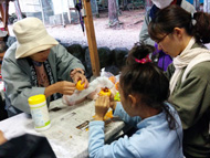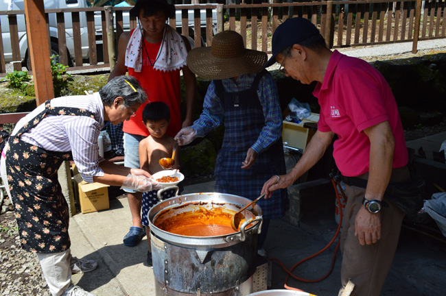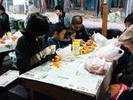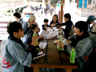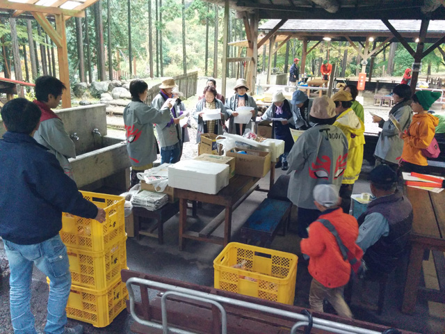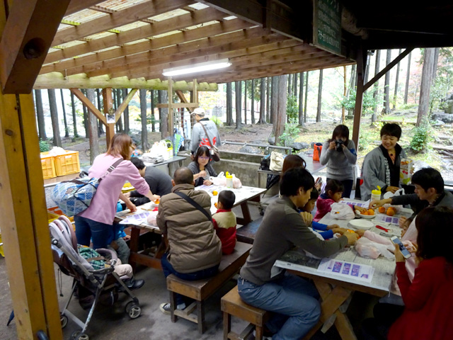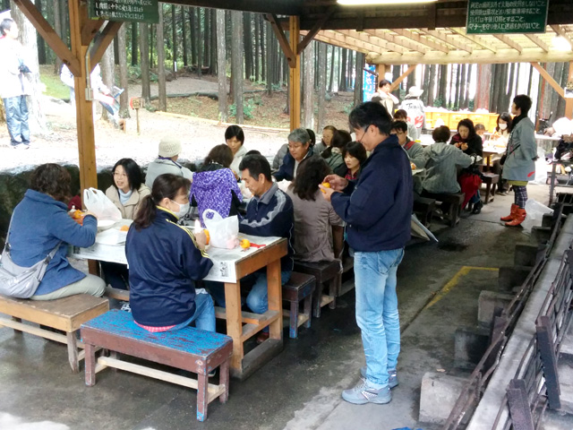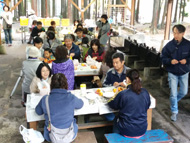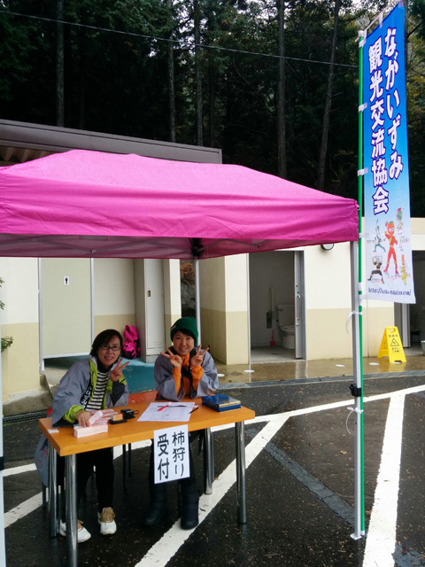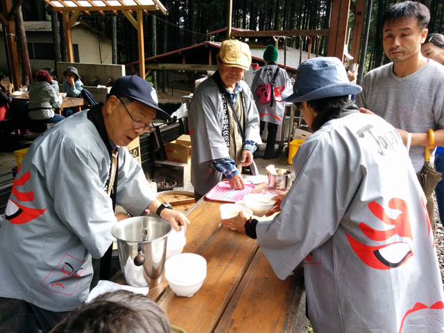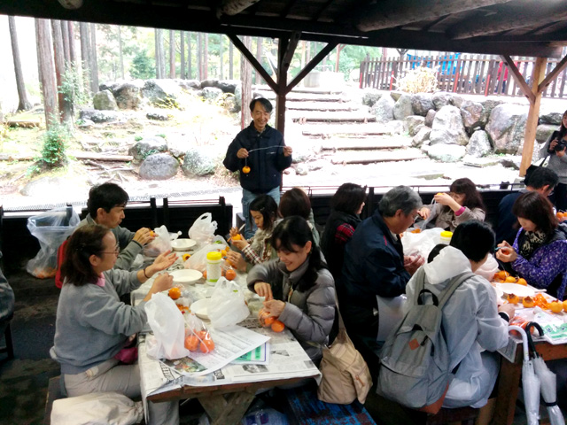 生憎の天気で急きょ、しぶ抜き体験と干し柿体験を行ないました。地場野菜たっぷりのあたたかい豚汁をご用意しました!