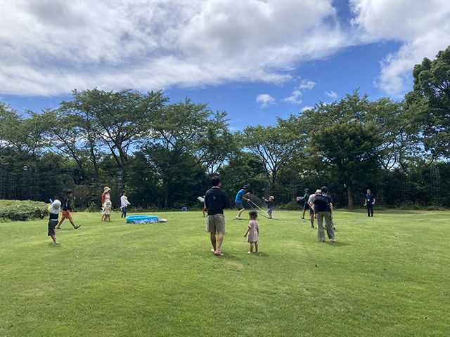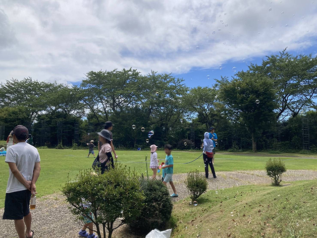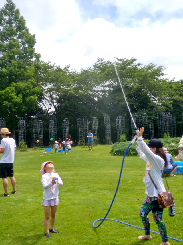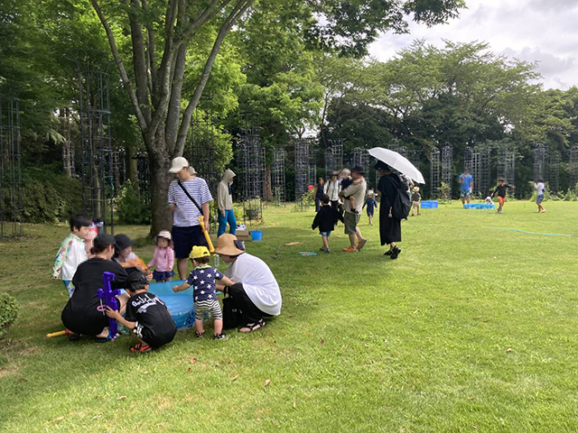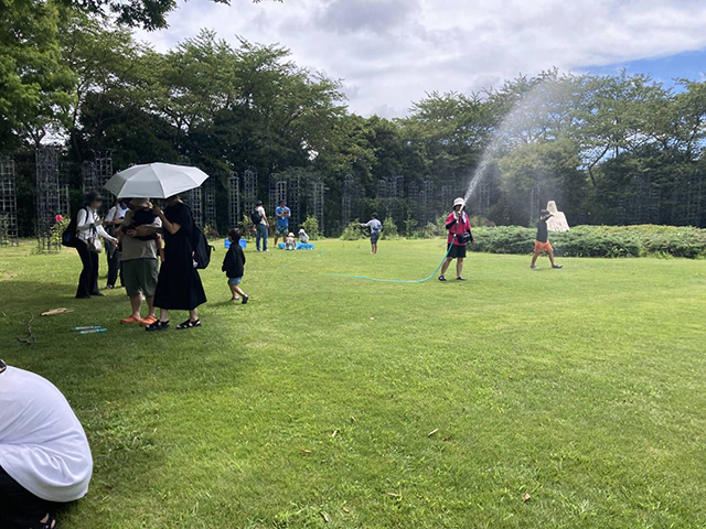新文化施設(旧ヴァンジ彫刻庭園)で初めて「びしょぬれイベント」を開催しました。庭園の芝生の上を思いっきり駆け回り、水をかけあい、びしょぬれになって遊んでもらいました。ありそうでなかったイベントに参加者からは大好評でした。